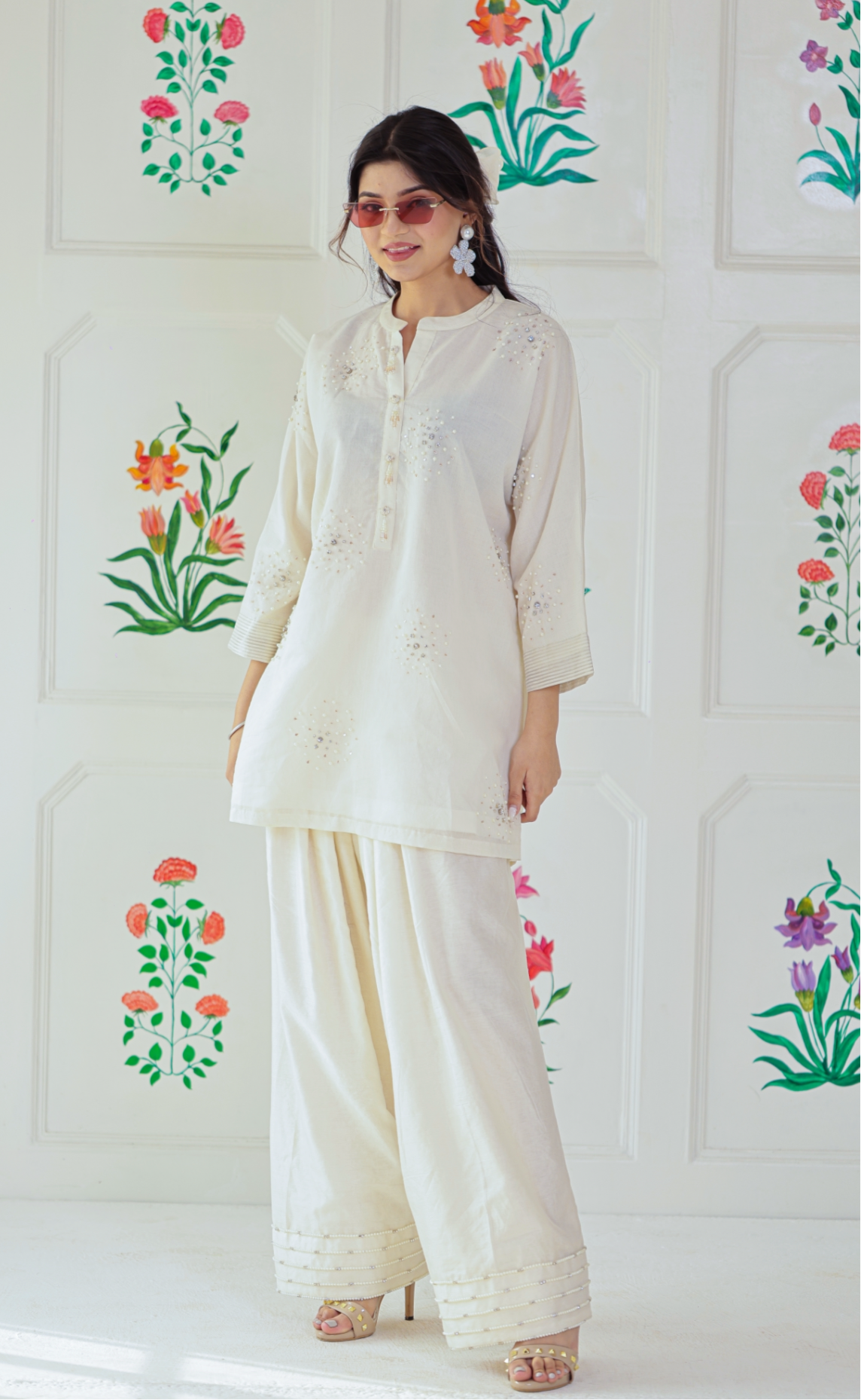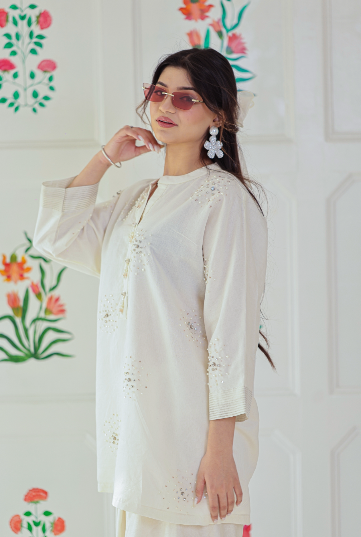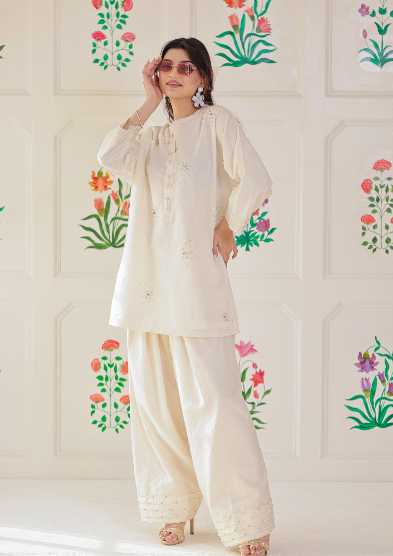 White kurta with farshi salwar- Stones & Pearl Detailing